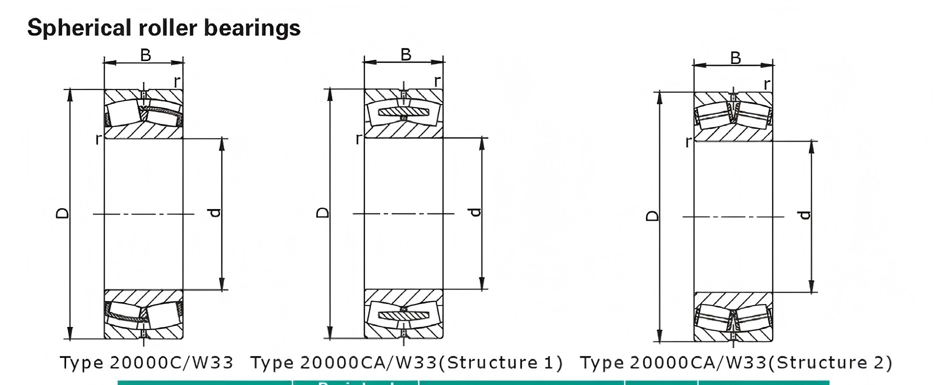 Features: Spherical roller bearings, whose inner ringss have two raceways, and outer race-ways are spherical. The centers of curvature of outer raceways are alse the bearing centers. The bearings possess self-aligining performance, the permissible disalignment angle is 1-2.5°, and can be used in certain permanent deflective application.